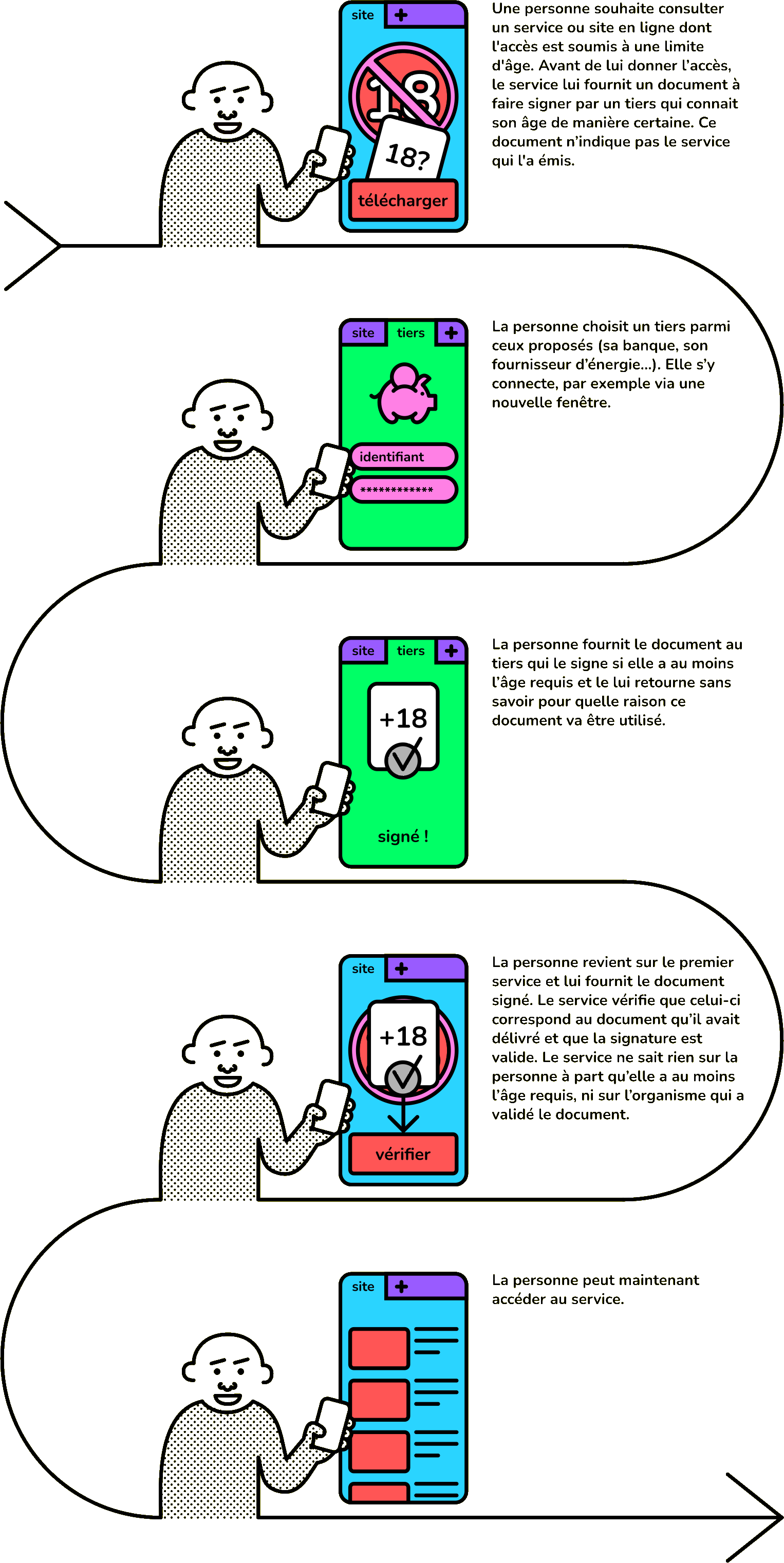 - le prestataire de la solution de contrôle d’âge connaît l’identité de l’internaute, mais ne sait pas quels sites il consulte.