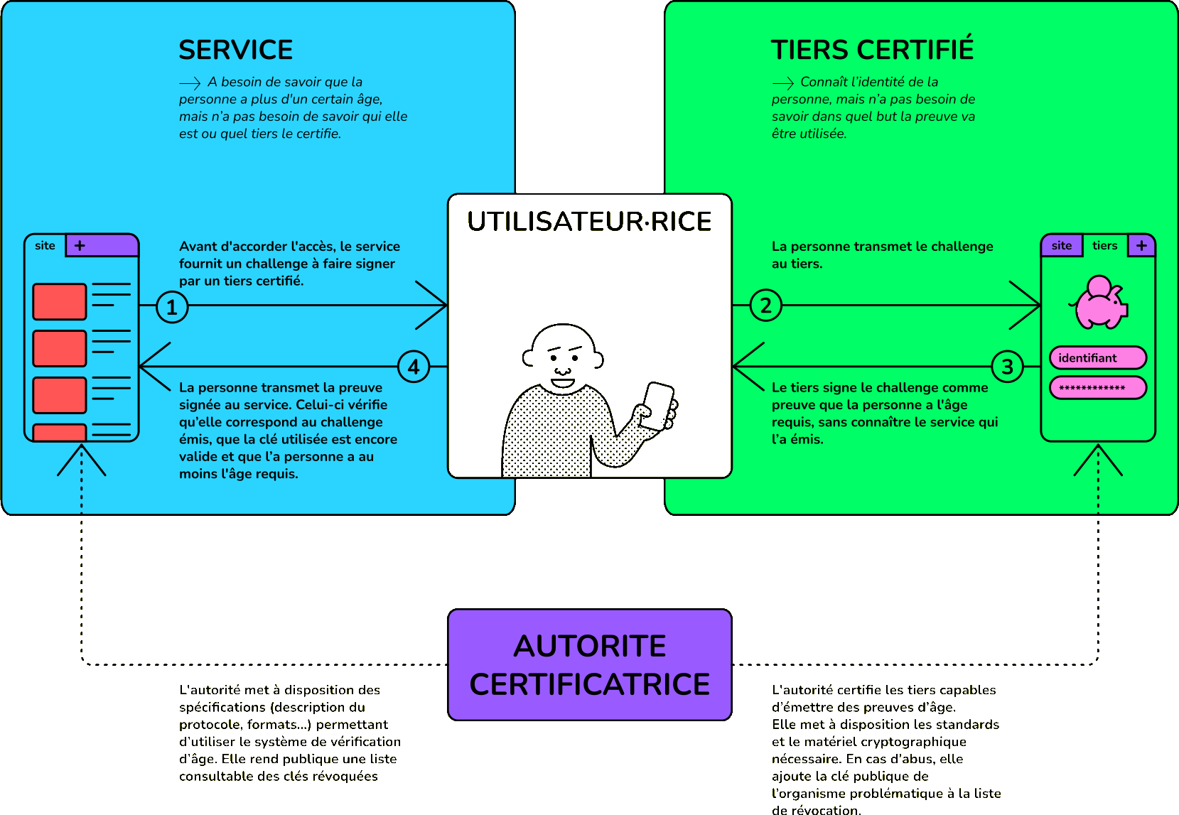 - celui qui transmet la preuve d’âge au site peut connaître le site ou service que l’internaute consulte mais ne connaît pas son identité (dans la solution « idéale » développée plus bas, la preuve d’âge transite par l’utilisateur, ce qui permet un compartimentage entre les acteurs) ;