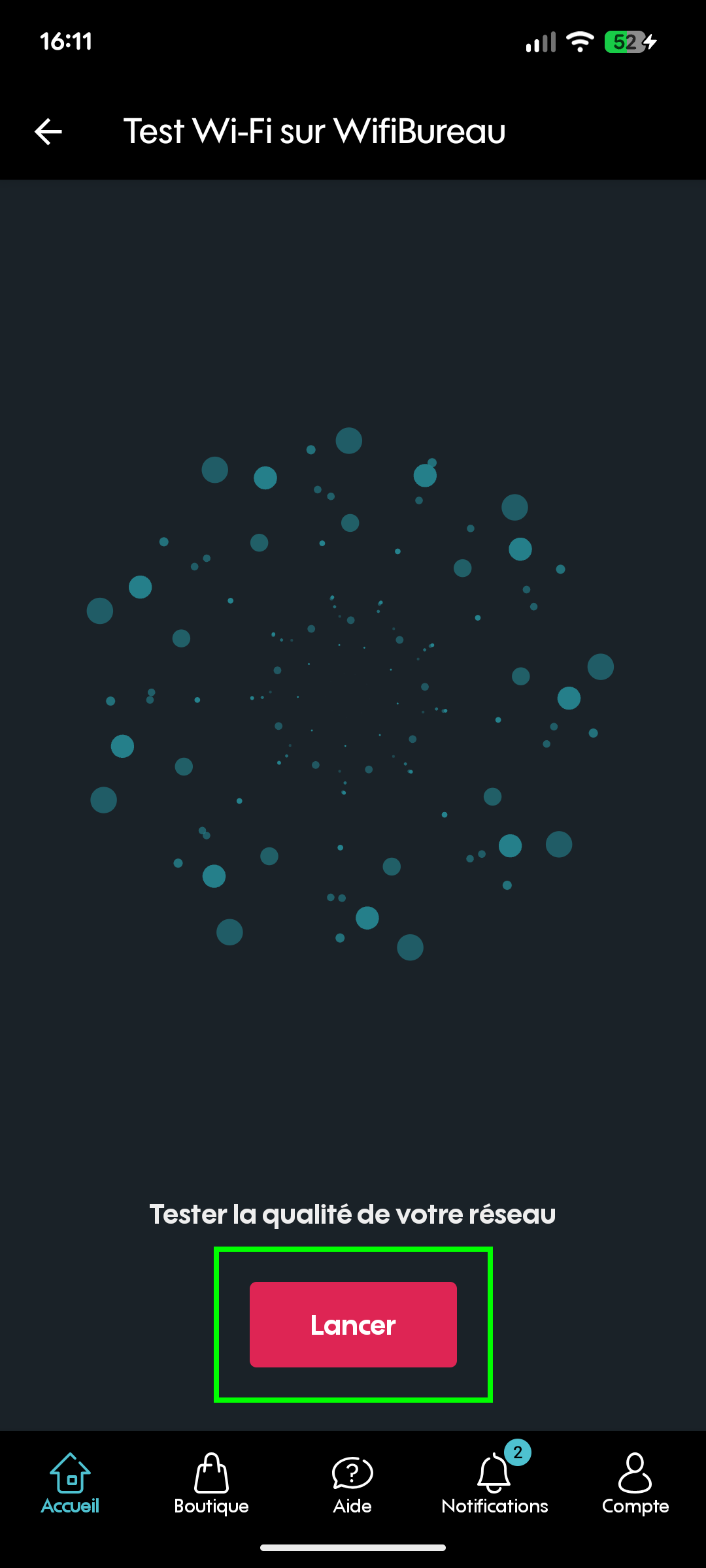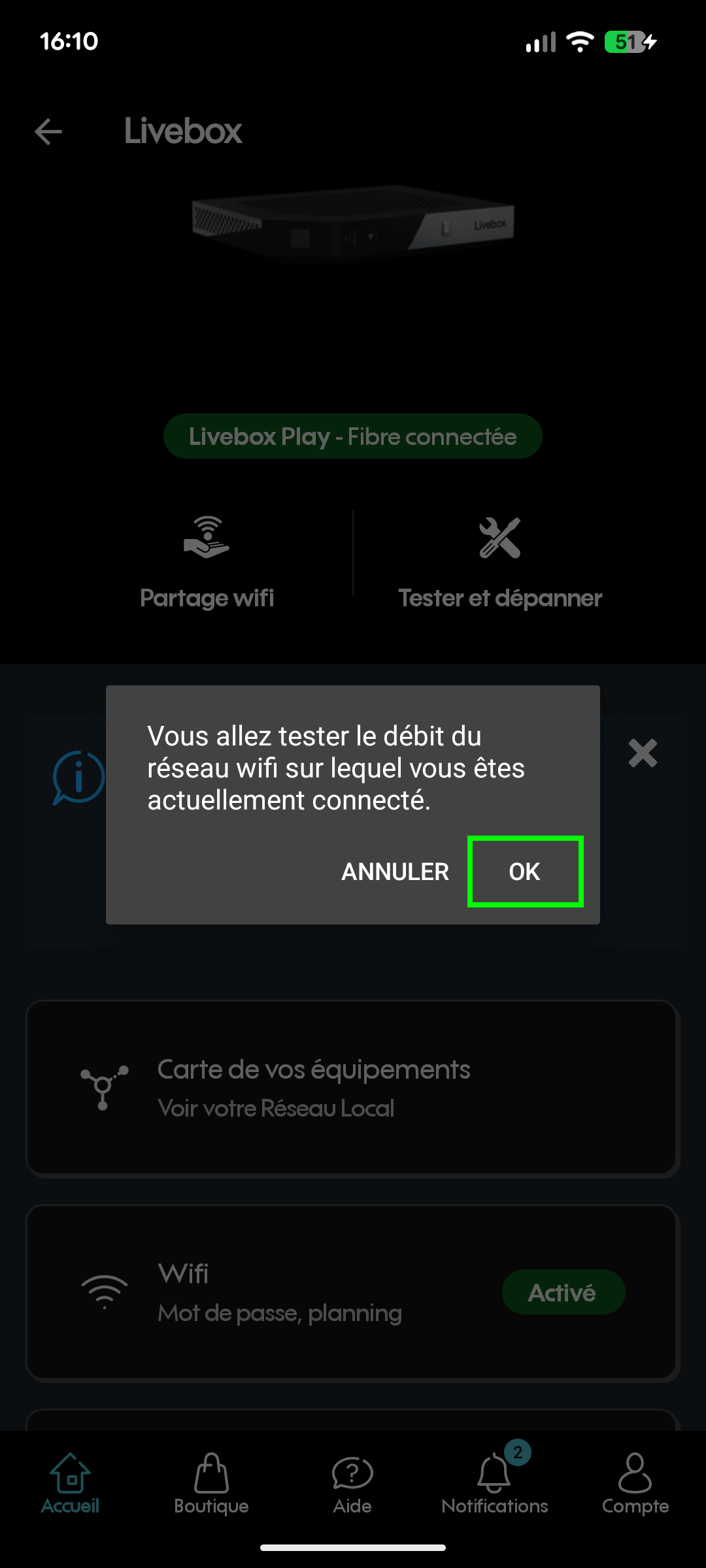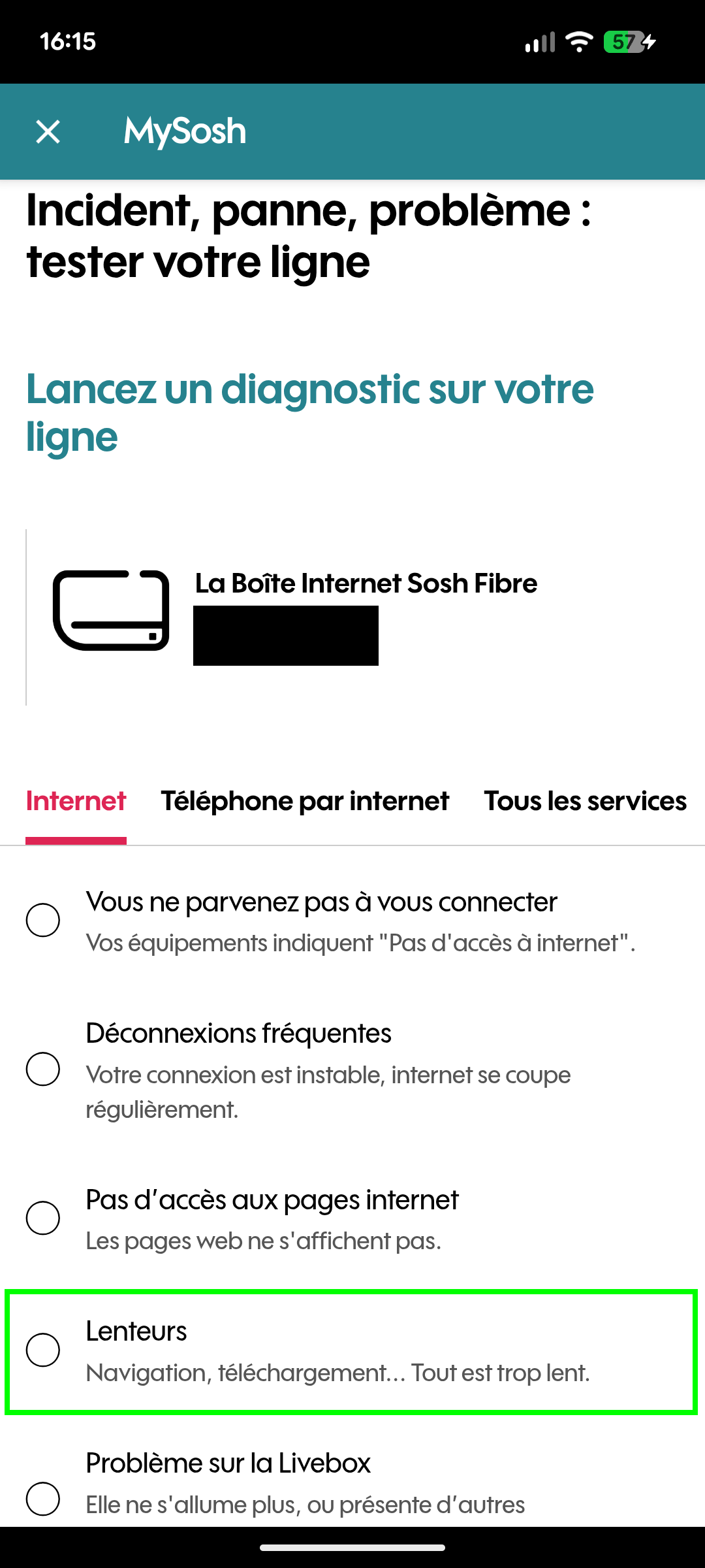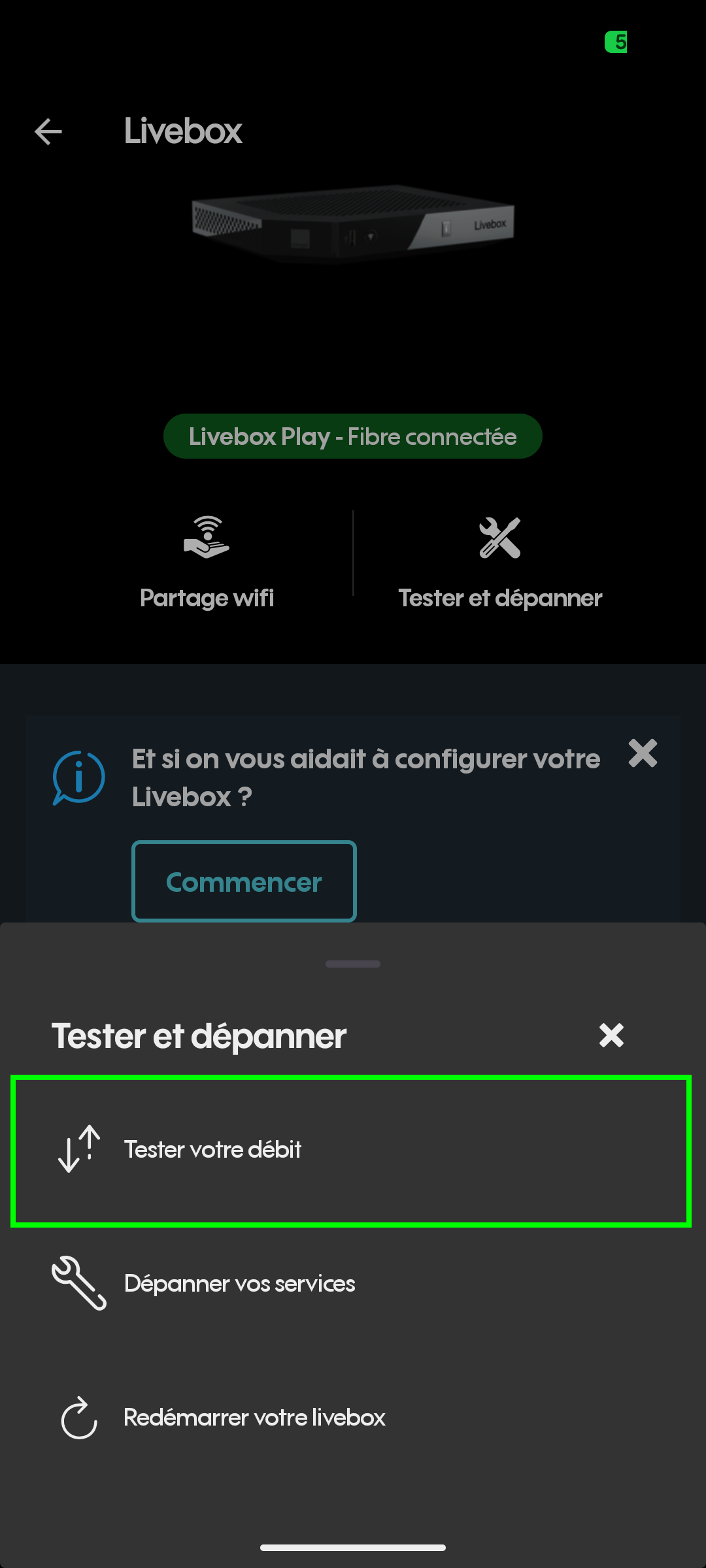 Voici la méthode pour lancer le test avec MySosh (ici, ce sera sur une Livebox 3 FTTH). J'ai entouré en vert les action à réaliser.
