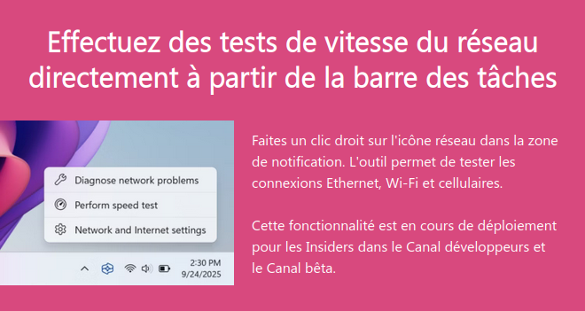 Nous introduisons la possibilité d'effectuer un test de débit réseau intégré, accessible depuis la barre des tâches. Vous pouvez le lancer via les pages de paramètres rapides Wi-Fi et cellulaire ou en faisant un clic droit sur l'icône réseau dans la barre d'état système.