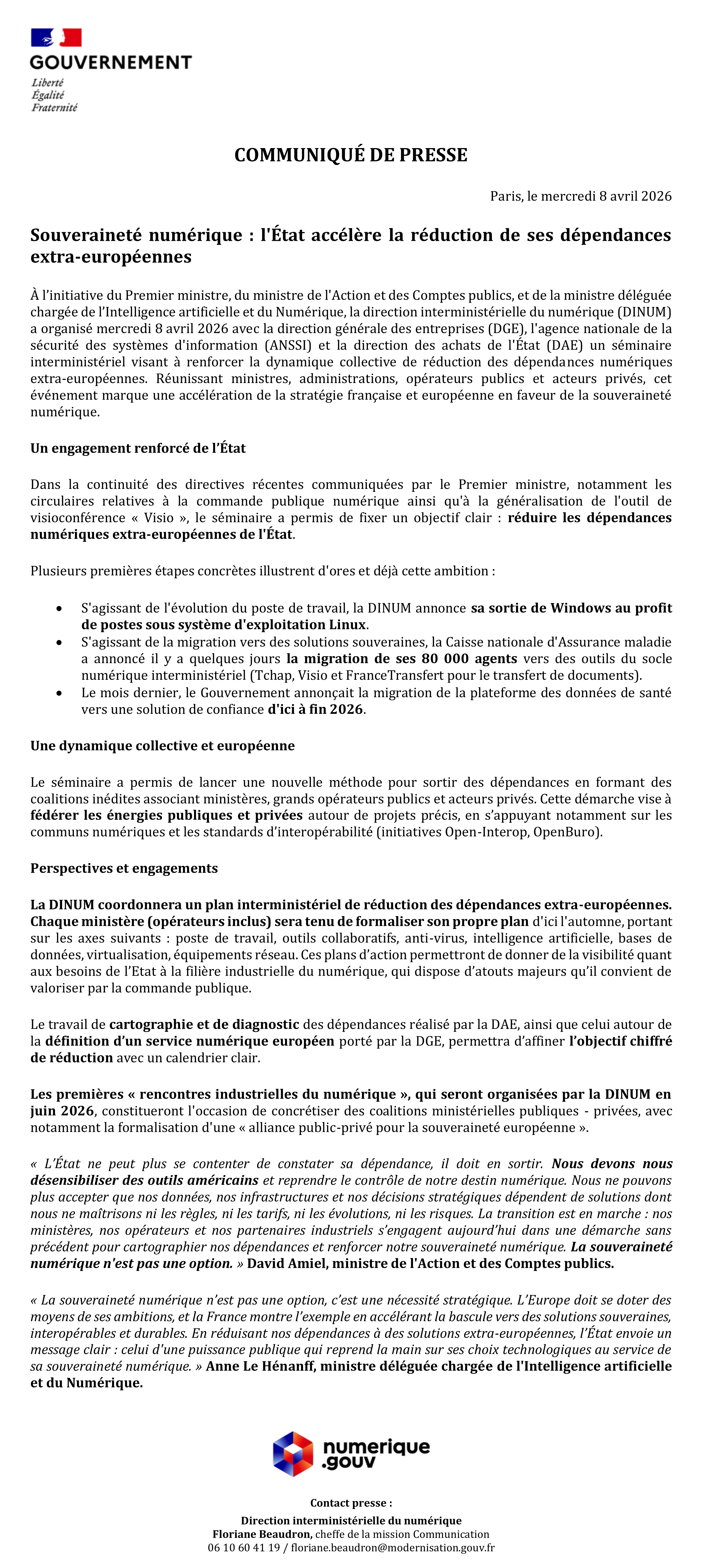Le communiqué de presse et clair et sans ambiguïté : S'agissant de l'évolution du poste de travail, la DINUM annonce sa sortie de Windows au profit de postes sous système d'exploitation Linux.