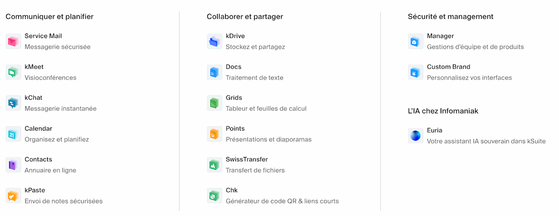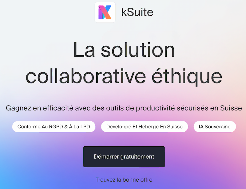 De plus contrairement à l'original, kSuite ne propose pas de client lourd : tout se passe dans le navigateur web. Par contre, contrairement à la solution cloud de OnlyOffice (que je n'ai pas mis dans le tableau, je me suis limité à la version desktop gratuite et la version auto-hébergée), Ksuite est hébergé en Suisse, ce qui est bien mieux que ce que propose OnlyOffice.
