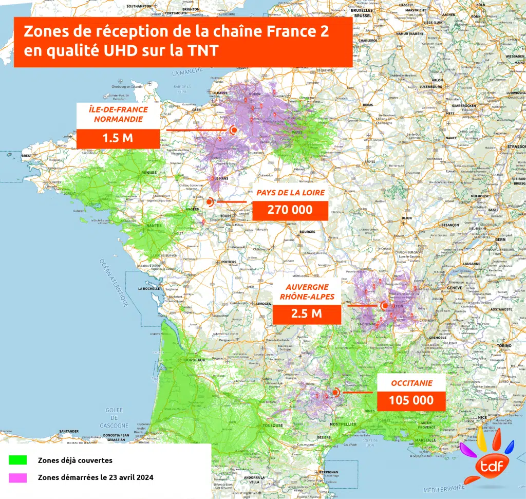 La chaîne UHD de France 2 est disponible 24 heures sur 24 sur le canal 52 de la TNT dans l'Hexagone et 22 en Outre-mer depuis le mardi 23 janvier, tandis que celle de France 3 arrive le 10 juillet sur le canal 53 de la TNT dans l'Hexagone et 23 en Outre-mer pour une durée de deux mois.