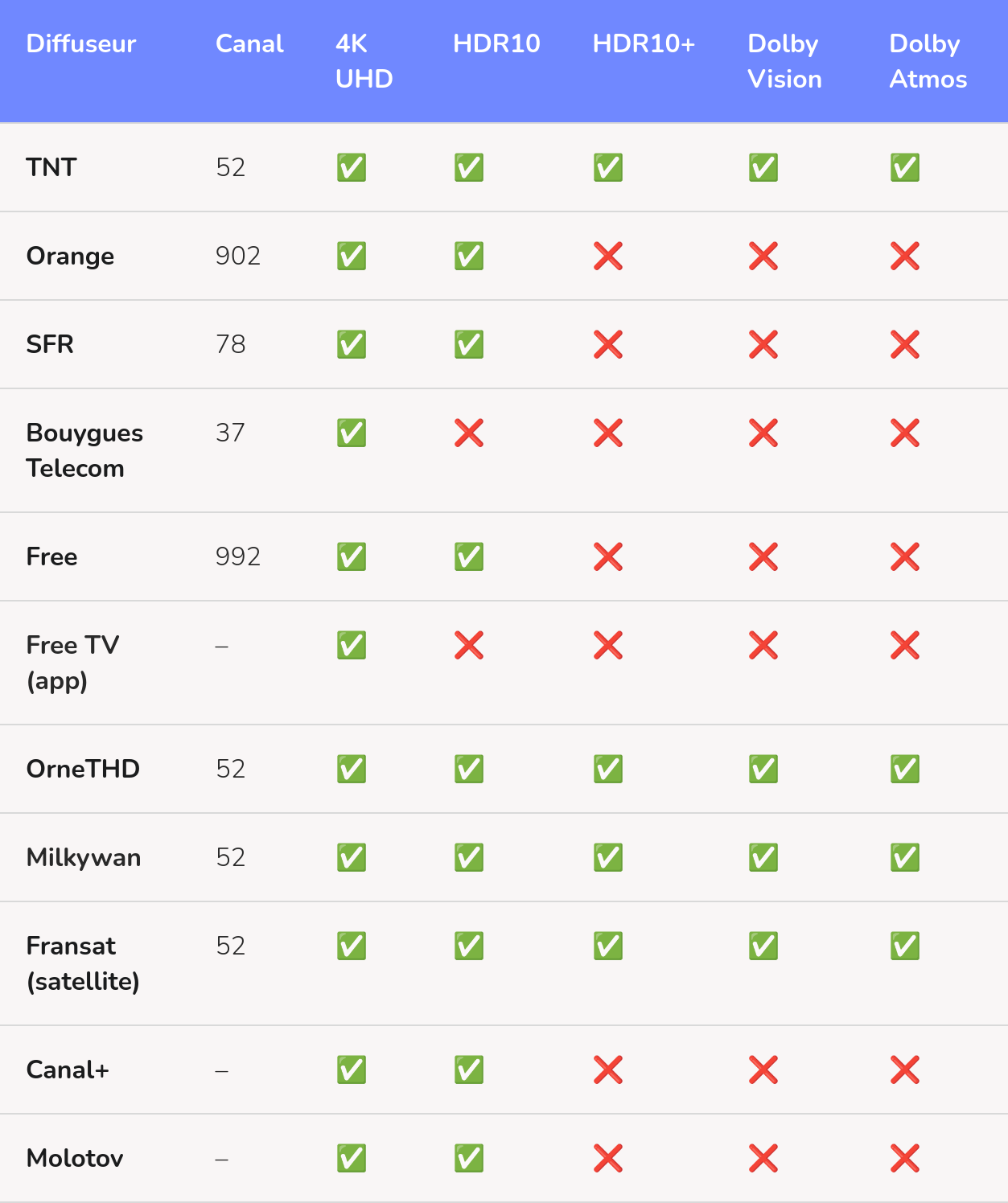 Les quatre gros FAI ont dans leurs offres (internet + TV) des décodeurs TV qui supportent le Dolby Vision mais ne diffusent pas cette qualité vidéo sur leurs réseaux