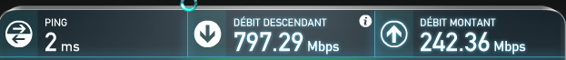 Pour  le débit, as tu essayé de démarrer ton PC en mode "sans échec avec prise en charge du réseau" et refaire le speedtest.J'ai, pour ma part, refais un test il y a 10 mn dans ce mode avec 860 Mbits en download comme après l'installation (rue Maurice Ravel) (vérifi que tu ne satures pas des CPU).