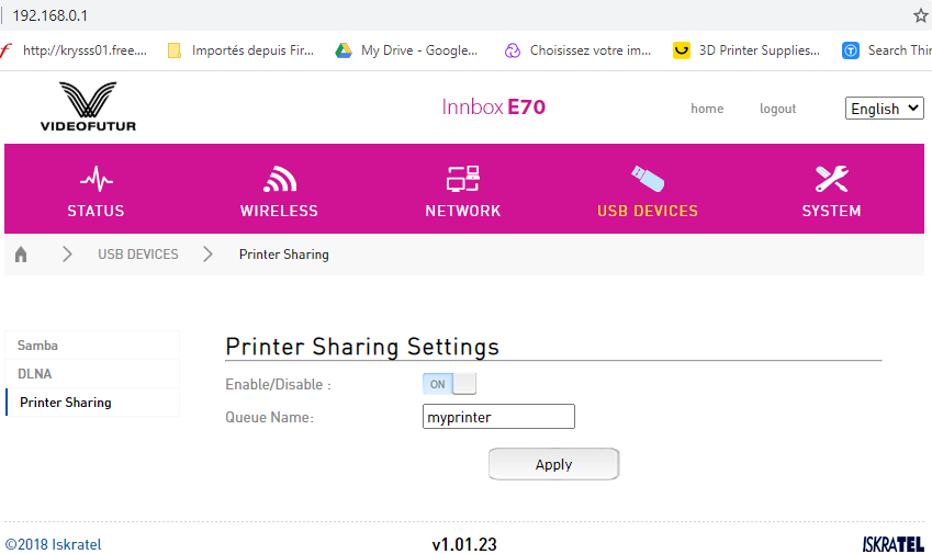 Je cherche à raccorder ma vieille imprimante USB sur le routeur de videofutur, sur son port USB.