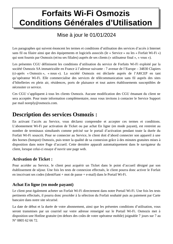 Conditions Générales d’Utilisation du Wi-Fi OsmozisOn comprend que ces minutes gratuites sont proposées pour tester le service avant l'achat : Pour se connecter au Service, le client doit d’abord connecter son appareil à une des bornes (hotspot) Osmozis, puis tester la qualité de sa connexion grâce à des minutes gratuites mises à disposition dans notre Page d’accueil.(cliquez sur la miniature ci-dessous - le document est au format PDF)