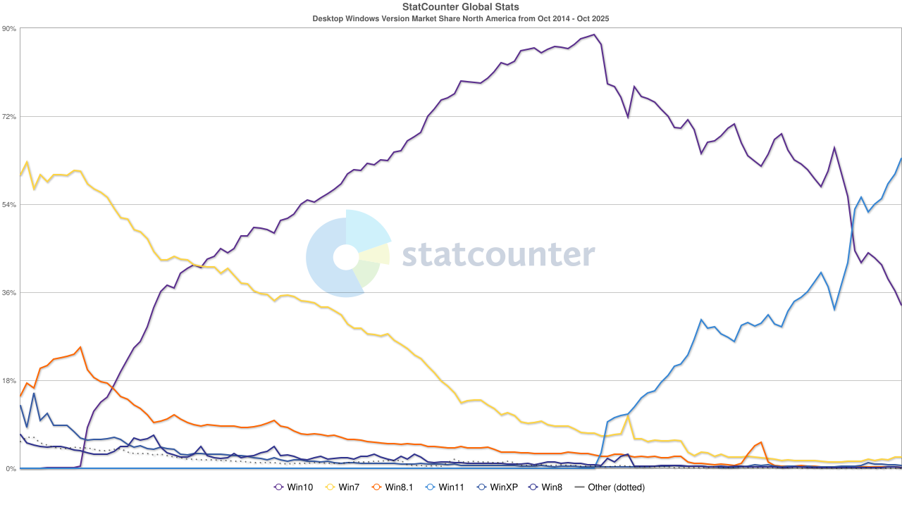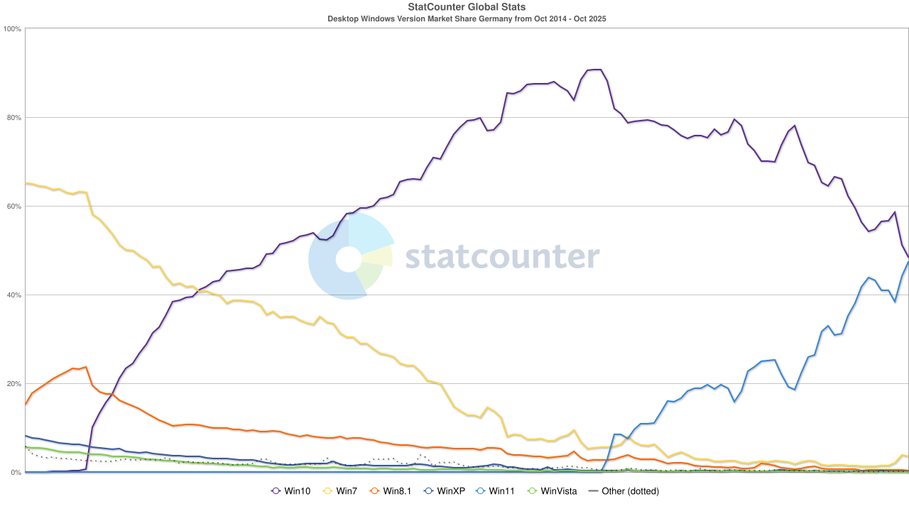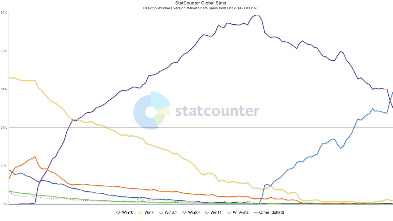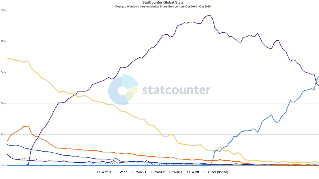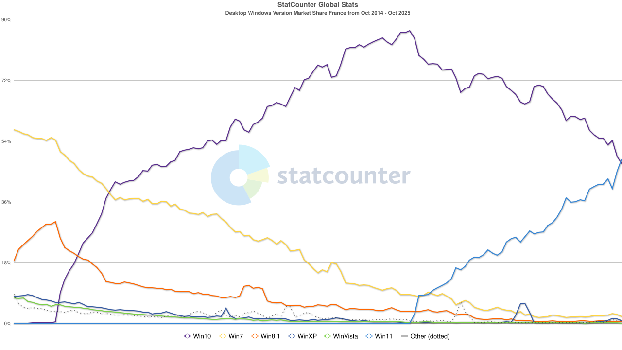 Pour ce qui est des parts de marché, la veille de la fin de support de Windows 10 (hors mises à jour de sécurité étendues), en France, Windows 11 vient de passer devant Windows 10.