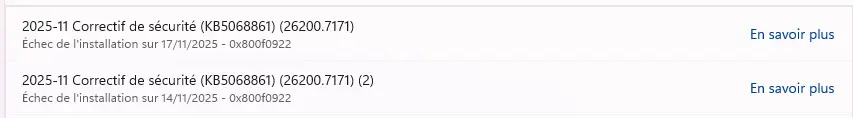 Échec de l'installation sur ‎17/‎11/‎2025 - 0x800f0922